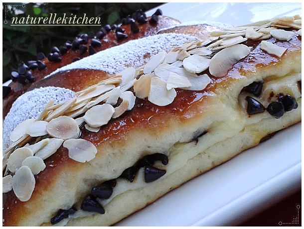 بعد مرور ساعتين ،نمدد العجين على سطح مرشوش بالطحين و نحاول إعطاءه شكل مستطيل (ﻻ ننسى رش الطحين في كل مرة تفاديا ﻻلتصاق العجين ﻻنه خفيف جدا) ، نضع الكريمة على نصف المستطيل و نرش حبيبات الشوكولا